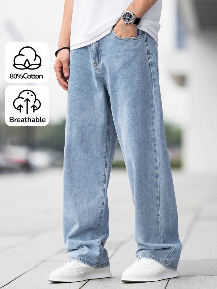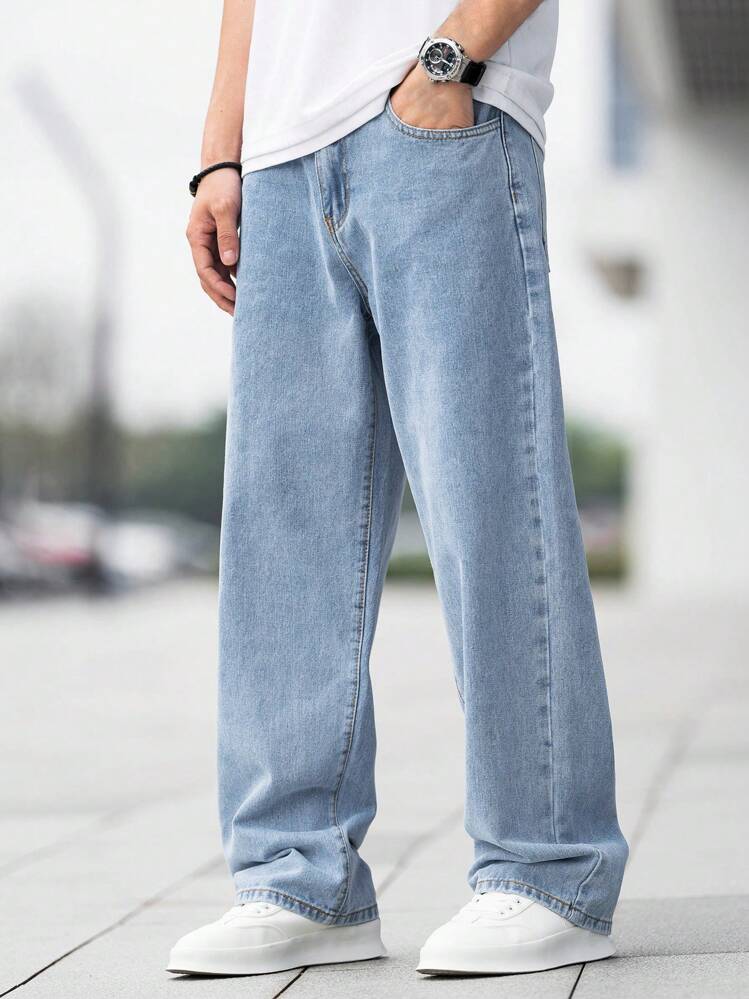 بنطلون جينز أزرق كاجوال بتصميم بسيط فضفاض لشباب ساق مستقيمة مناسب للاستخدام اليومي والجميع المواسم