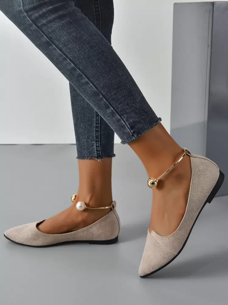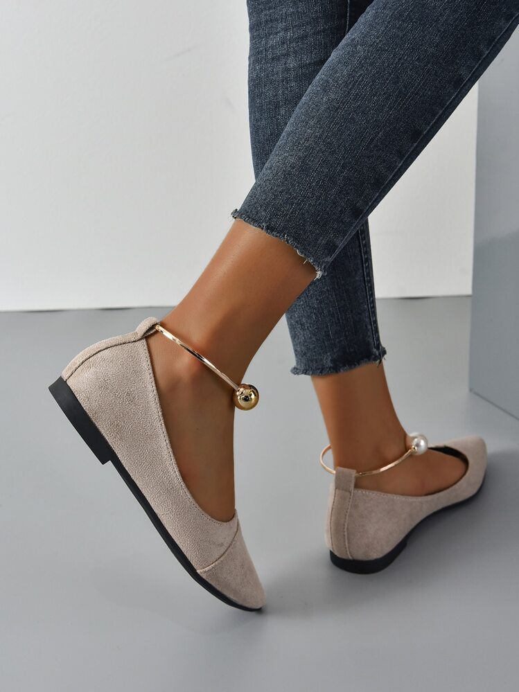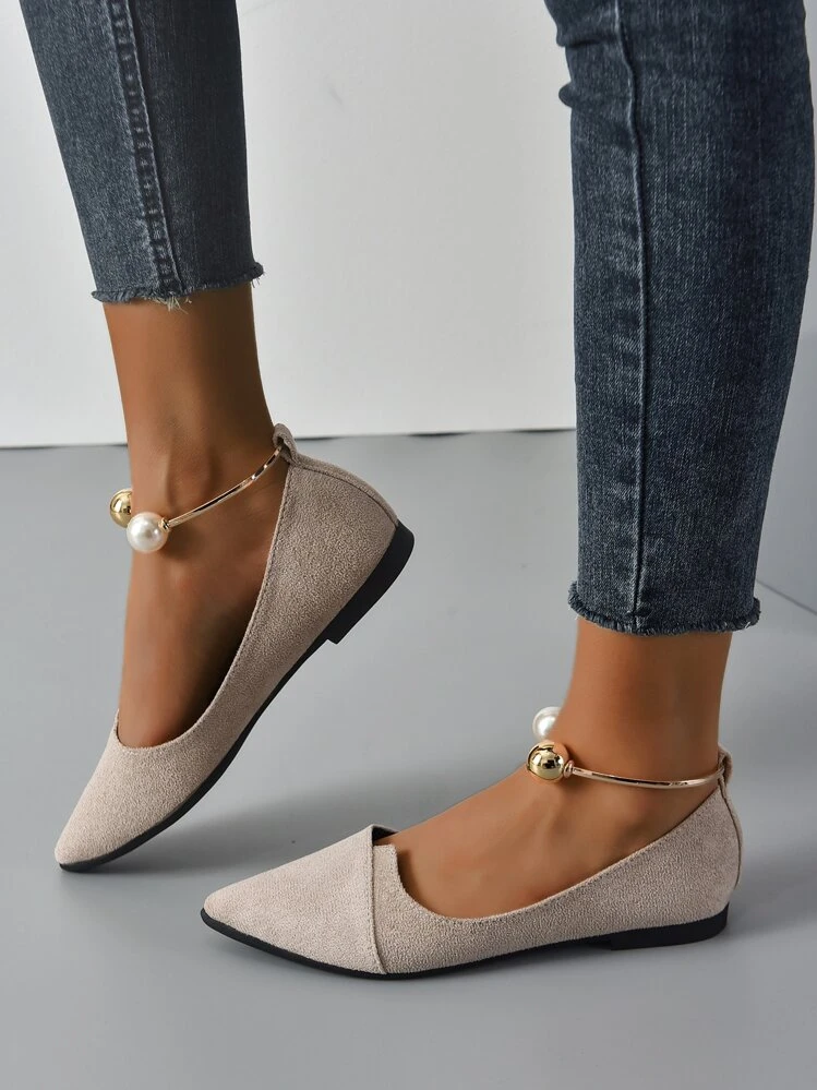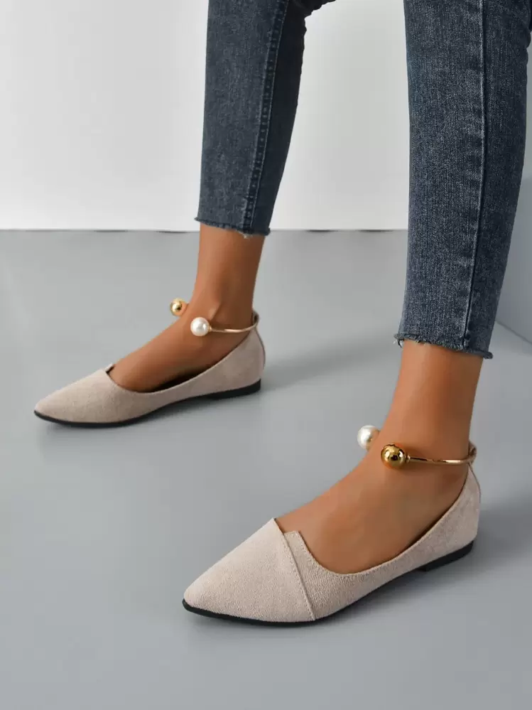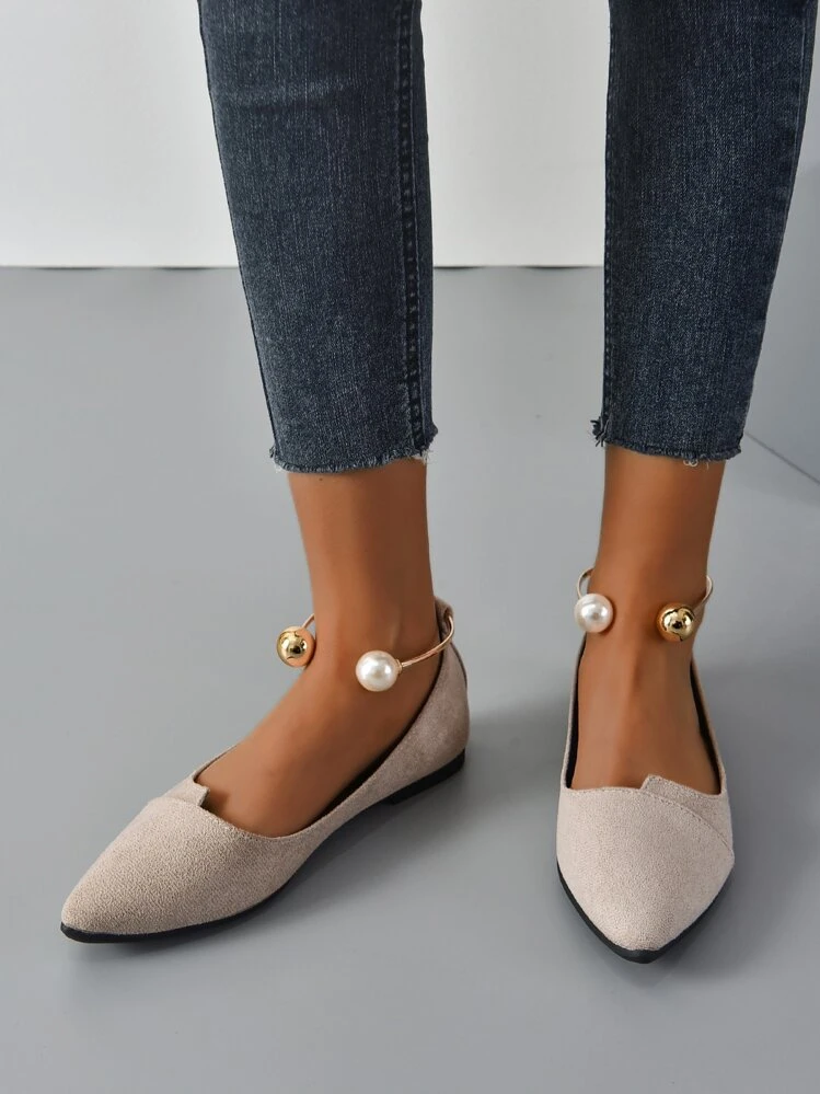 حذاء مزخرف بلؤلؤ اصطناعي باصابع قدم مدبب حذاء مسطح بحزام كاحل