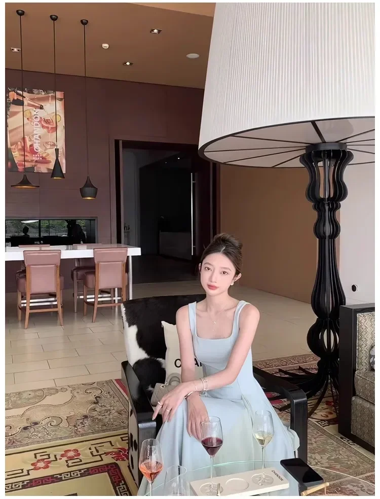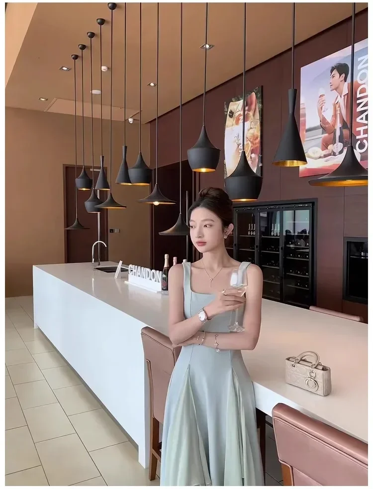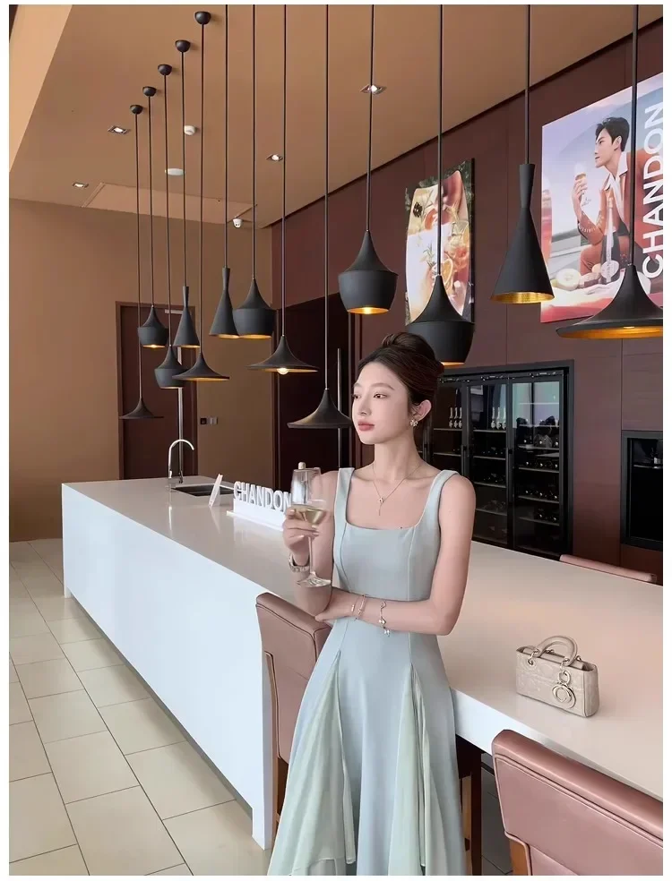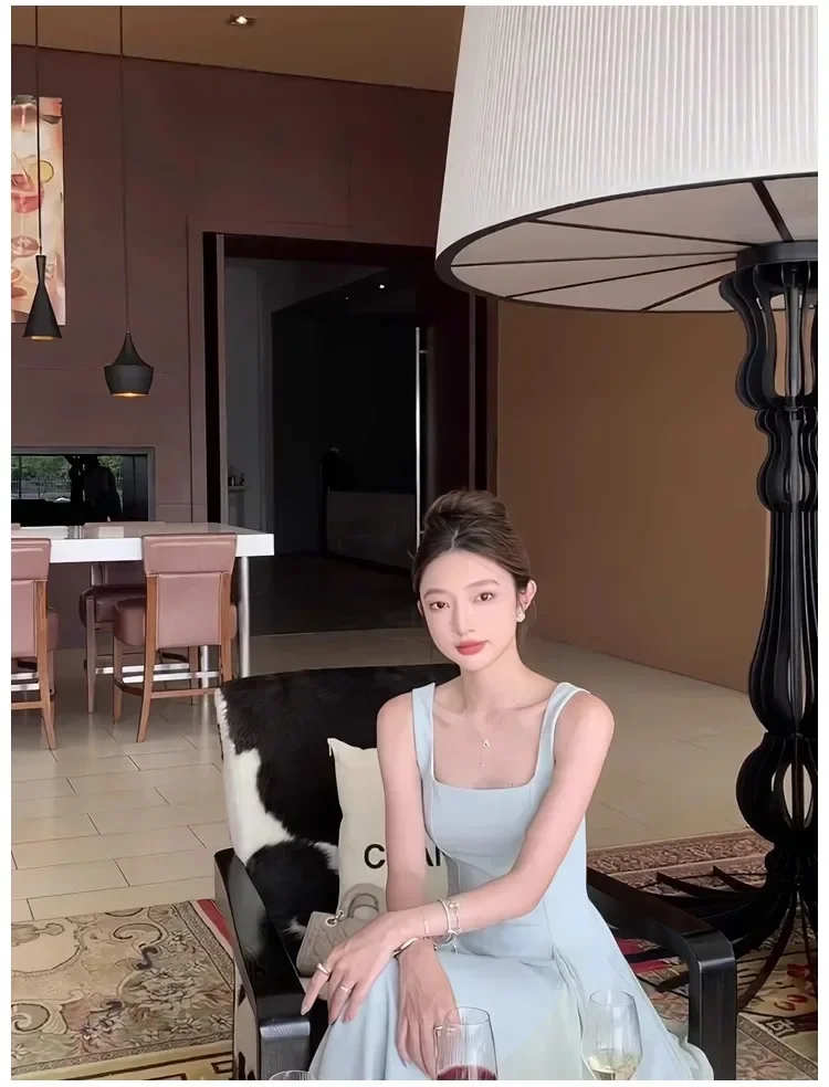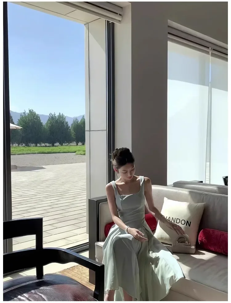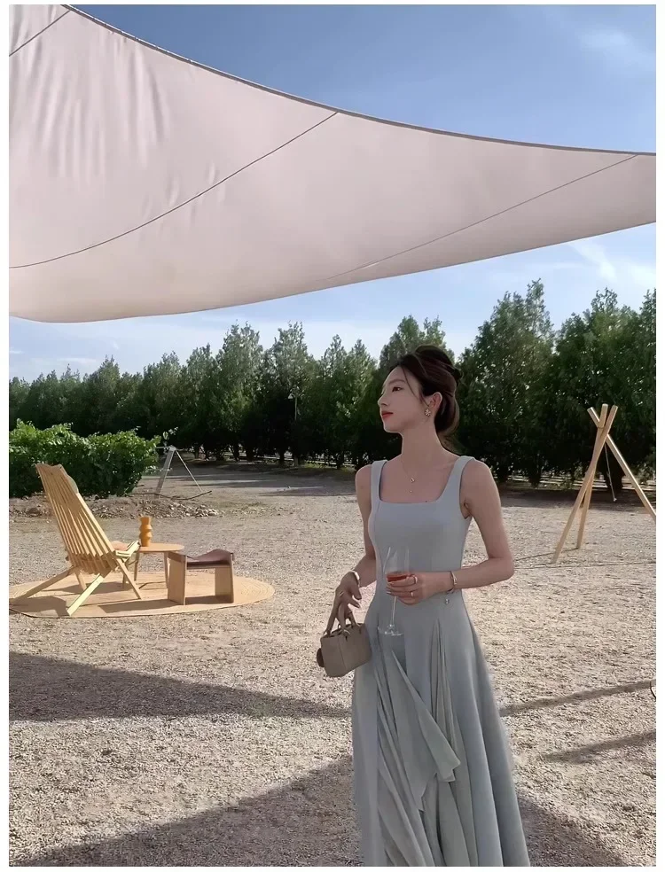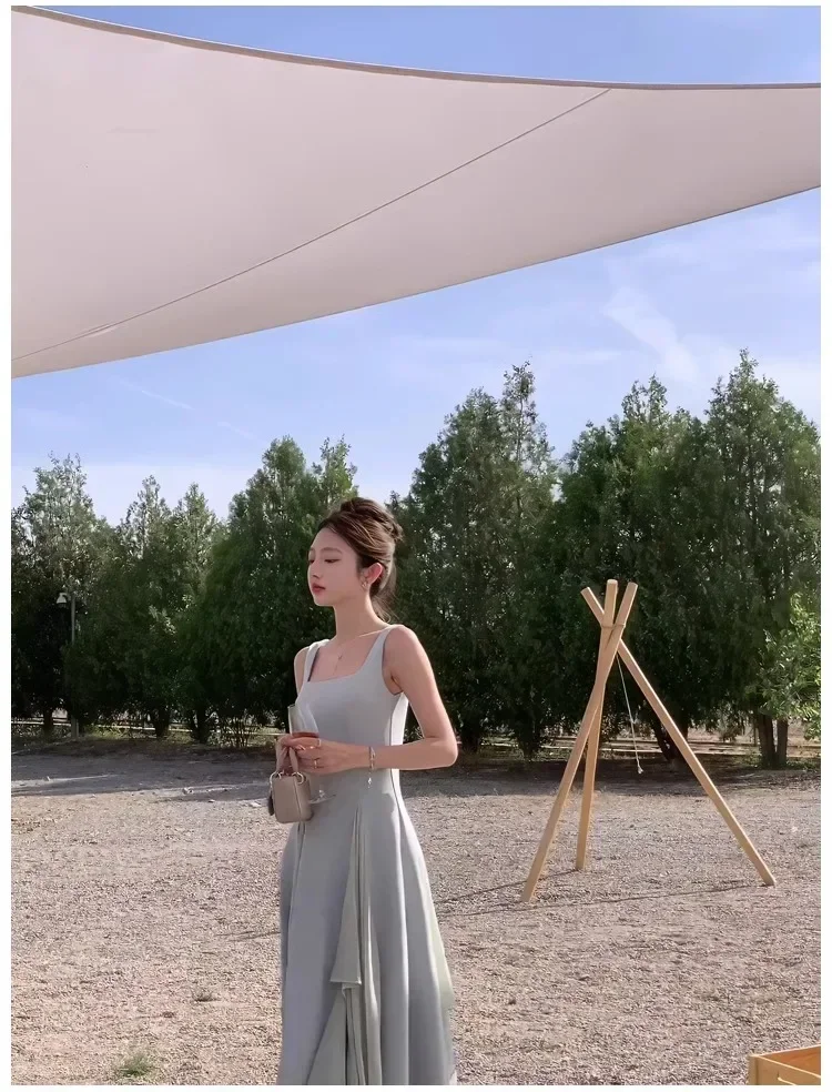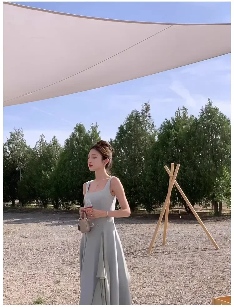 فستان نسائي غير رسمي بدون أكمام ، ياقة مربعة ، فساتين طويلة ، قصة فضفاضة ، خصر مرتفع ، قصة ضيقة ، قميص قصير صيفي ، أحادي اللون ، أساسيات ،