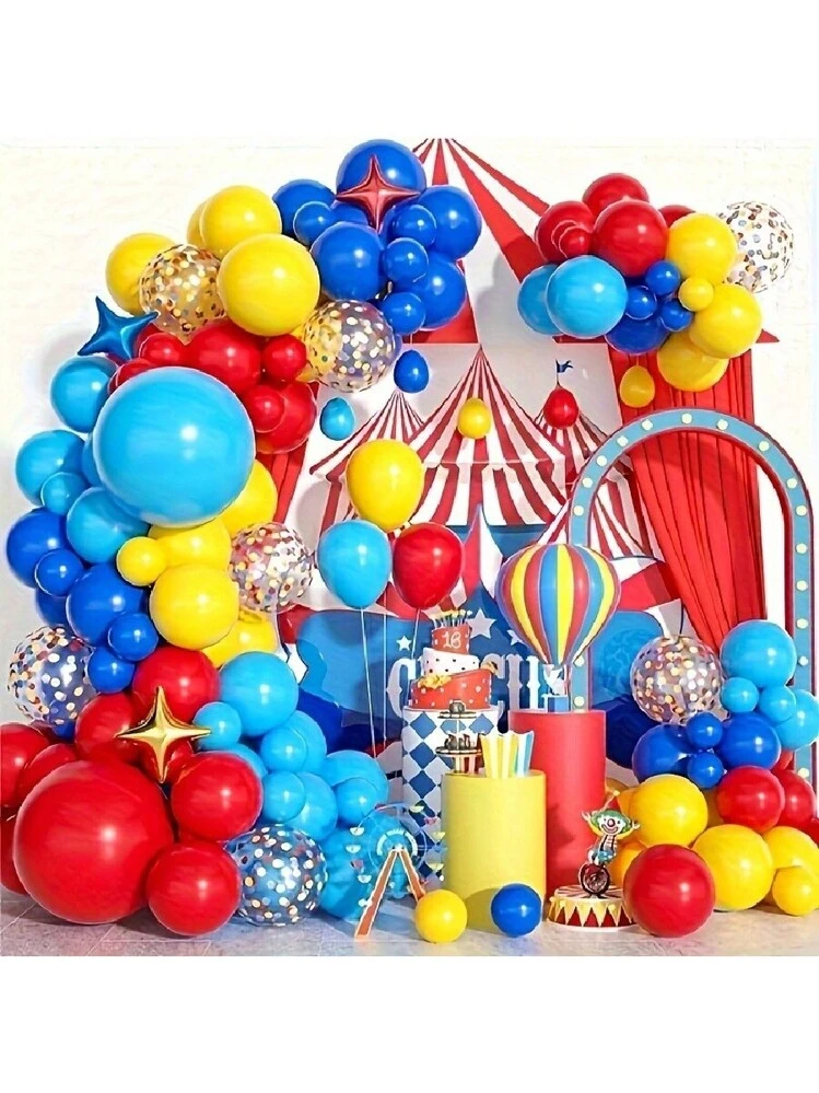 138 قطعة مجموعة قوس غارلاند البالونات بموضوع السيرك ، تشمل بالونات لاتكس باللون الأحمر والأزرق والأخضر والأصفر ، مثالية لديكورات حفلة الميلاد ، خلفيات ديكورية ، ديكورات التخرج ، لوازم حفلة موضوع السيرك