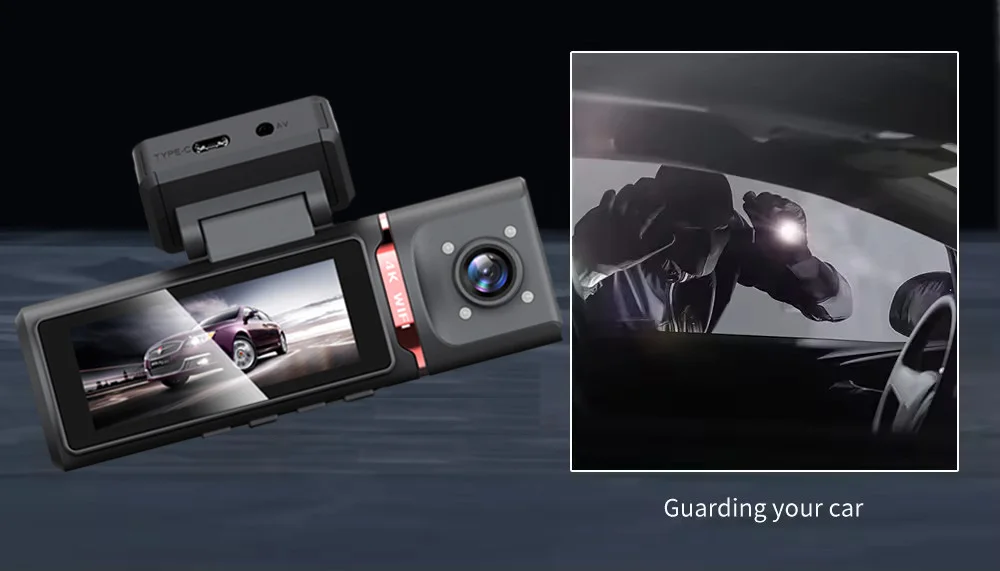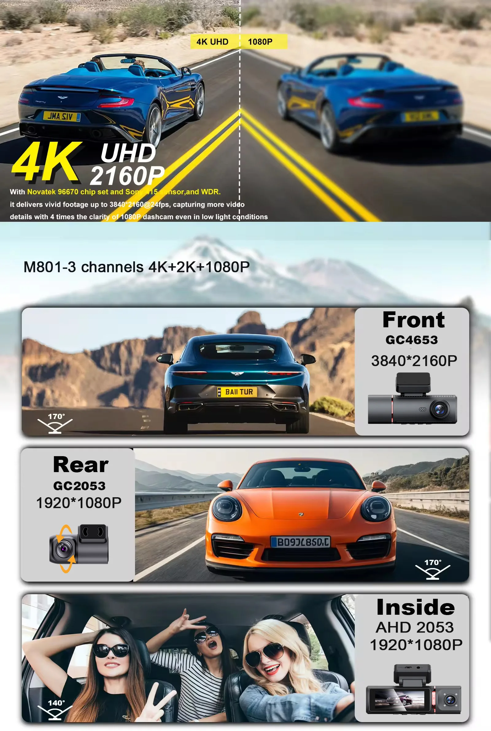 1.كاميرا داش ثلاثية العدسات 4K: تم تجهيز كاميرا داش الكاميرا هذه بكاميرا أمامية بدقة 4K*720*1080 بمعدل 30 إطارًا في الثانية/كاميرا داخلية/خلفية، والتي يمكنها تسجيل الجزء الأمامي/الداخلي والخلفي في نفس الوقت.